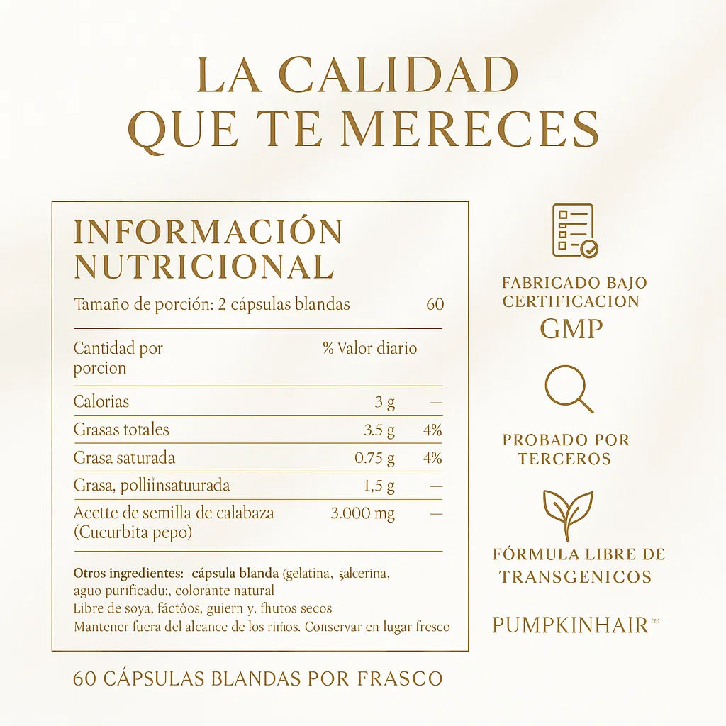 PumpkinHair™ es un suplemento natural premium que combina Aceite de Semilla de Calabaza prensado en frío + Saw Palmetto, formulado especialmente para detener la caída del cabello y estimular un crecimiento fuerte, grueso y saludable 💆♀️✨